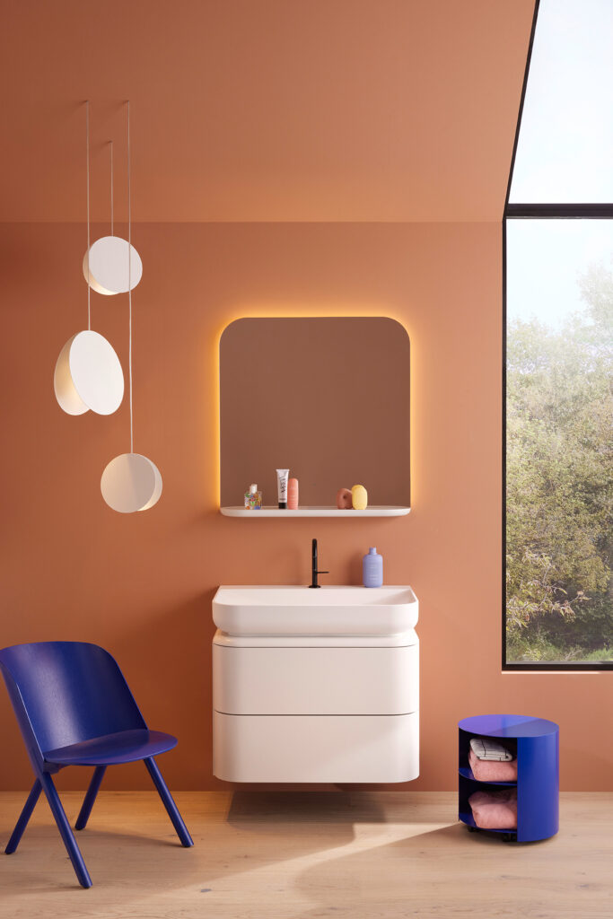 Dazu bietet die Kollektion im Design passende Wandspiegel und Spiegelschränke in entsprechenden Breiten. Die Wandspiegel verfügen über eine Ablage in Frontfarbe (150 mm Tiefe) und eine umlaufende LED-Beleuchtung mit Sensorschalter. Die komfortabel ausgestatteten Spiegelschränke (600 mm Höhe, 200 mm Tiefe; Außenkorpus dekorgleich) sind optional mit ein oder zwei LED-Aufsatzleuchten bestückt (plus 50 mm Höhe je Aufsatzleuchte), die wie schräg gestellte Lichtsegel das Rechteck des Spiegelschranks nach oben und unten weich abrunden und für eine optimale Ausleuchtung des Gesichts sorgen. Die Beleuchtung von Wandspiegel und Spiegelschränken ist dimmbar und per Lichttemperatursteuerung von Kalt bis Warmweiß, von funktional bis stimmungsvoll variierbar.
